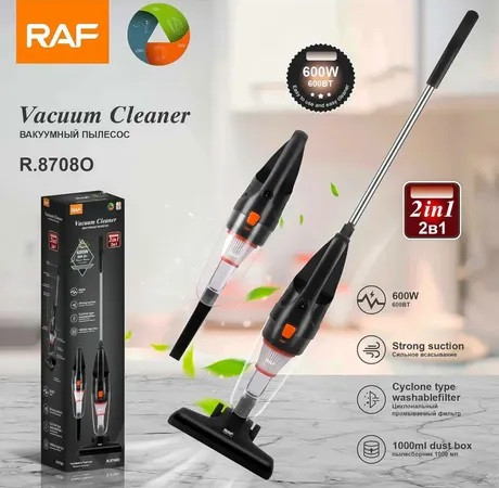 Вертикальний пилосос RAF R.8708 — це універсальний вертикальний пилосос 2в1 з потужністю 600 Вт, який легко перетворюється на компактний ручний. Завдяки технології циклонної фільтрації та триступеневій системі очищення з HEPA-фільтром, він ефективно справляється з пилом, шерстю й алергенами, забезпечуючи чистоту повітря.